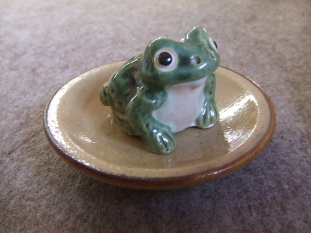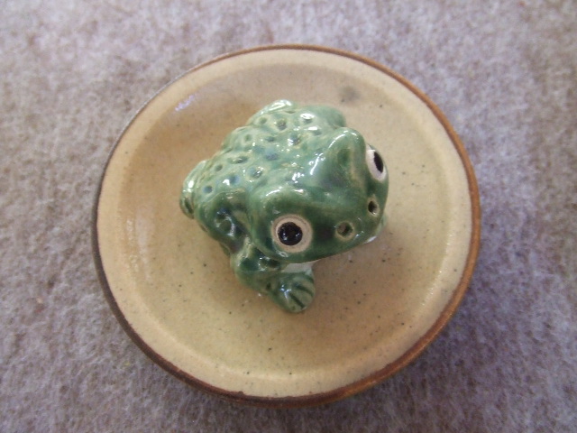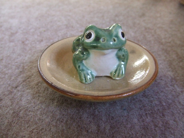 信楽【乗り青蛙】新登場! ひとつひとつ手づくりで制作された ”手づくり乗り蛙” 大戸の河の畔、陶都信楽の里に聖武天皇の御代より生息すると伝えられる信楽のガマ。 これを 福蛙(福返る) 金蛙(お金が返る) 宝蛙(宝が返る) 無事蛙(無事に家に帰る) 若蛙(いつまでも若く返る)とよばれているのです。 蛙サイズ:4:4:4センチ(1寸) 皿サイズ:9:9:2センチ