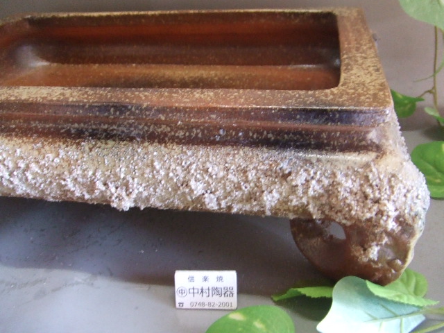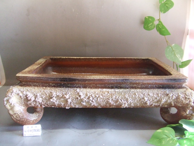 縁全面に岩石岩肌を施した長角水盤です
