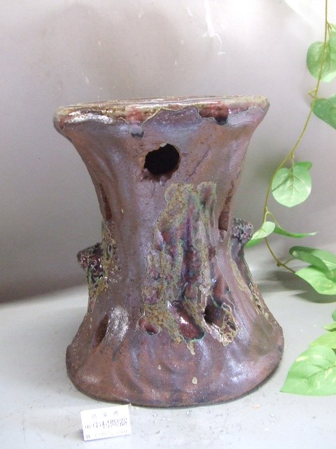 信楽焼らしさを駆使し、自然の古木をイメージして、上部は辰砂(赤)のガラス釉薬で焼き上げました。