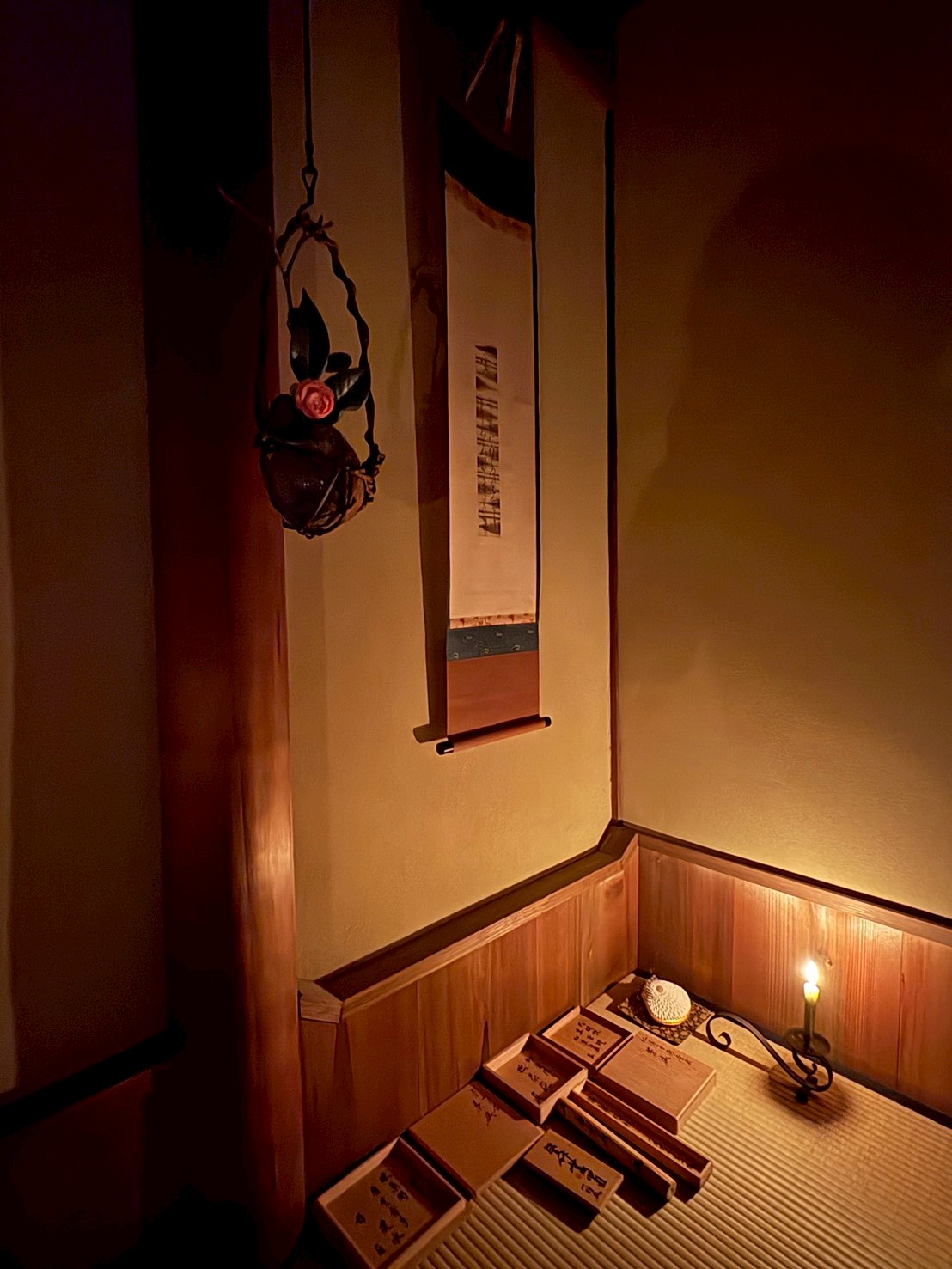 当りが暗くなり出した夕方の席煎り。燭台に和ろうそくが灯った風情ある設えが今年最後のお茶会です。