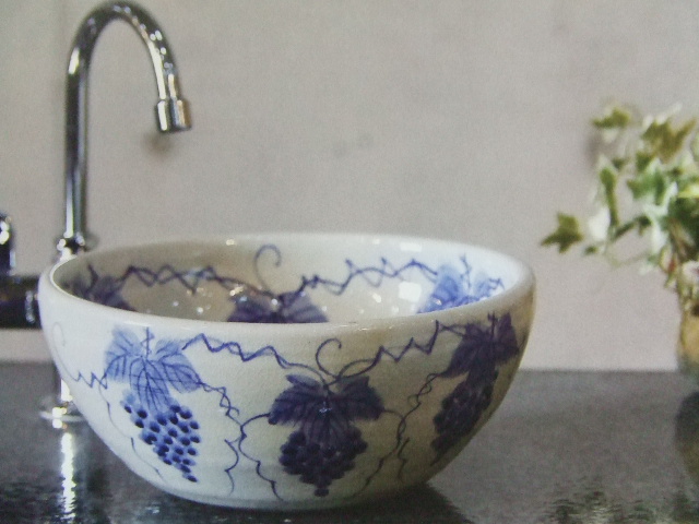手洗鉢・手洗いボールはwab販売のみです 基本的に店頭販売いたしておりません お電話での注文たまわります ★小型サイズ★ サイズ:横幅30cm奥行30センチ高さ13センチ カラー:透明釉薬に手描きぶどう絵 付属品:排水口金具をお付けしてお届けいたします。 お電話にてご注文をお受けいたします。お届け期日もお電話にてお伝えいたします。 ☎ 0748-82-2001 FAX 0748-82-1021